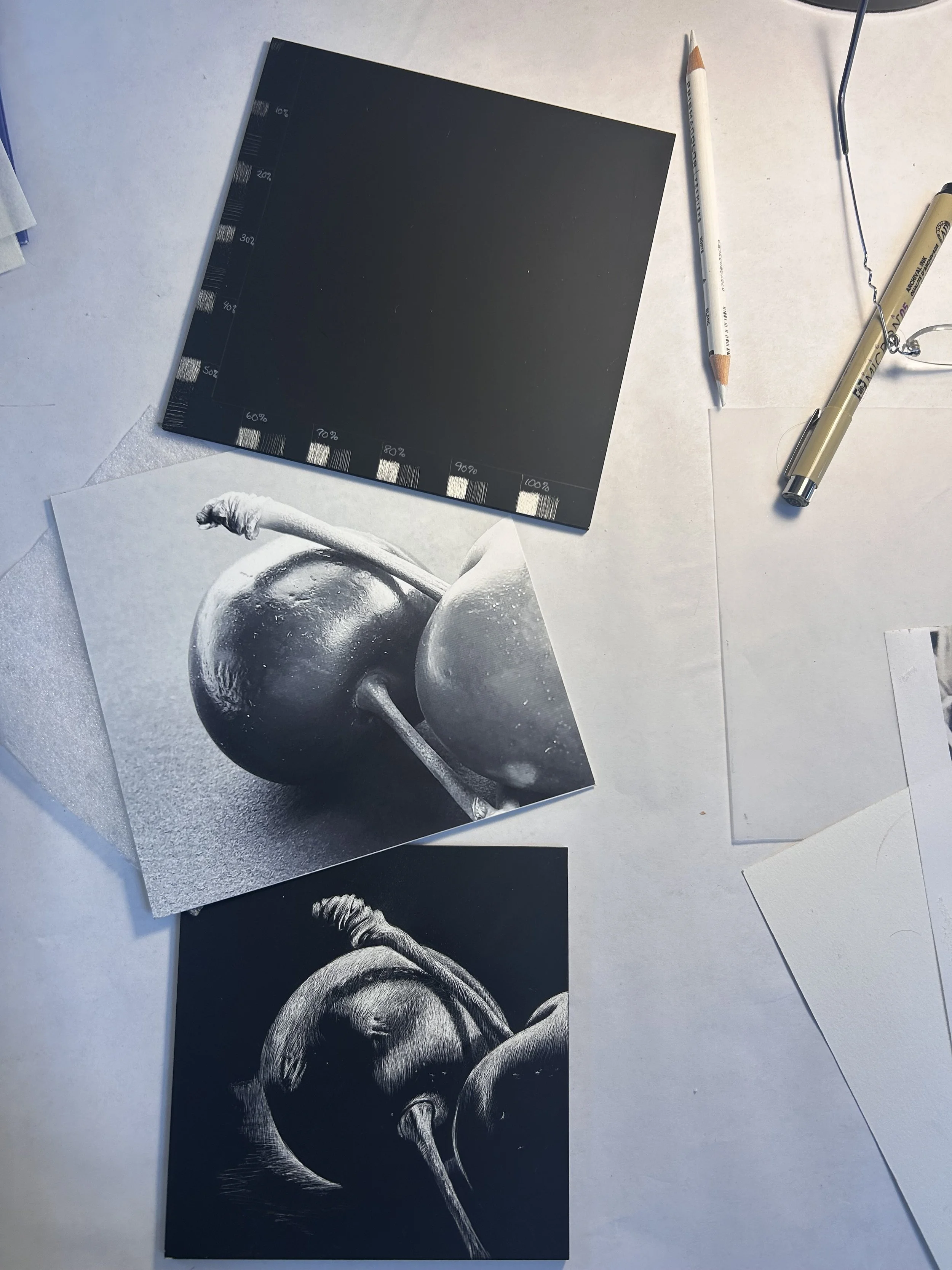 Scratchboard is a subtractive process. Rather than adding a medium, such as pencil, watercolor, or oil to a surface, the artist removes from the surface to produce the work. The manufactured base Masonite board used has white kaolin clay atop it, then black India ink atop the clay. Using a sharp instrument, usually an x-acto knife blade, you scratch away the ink with varying degrees of pressure and varying number of strokes to remove varying amounts of black ink; creating the full range of values from black to white. The more one scratches, the lighter the value.